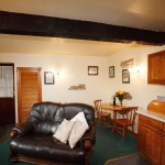 The accommodation is set out all on one level. It has a cosy double bedroom with modern en-suite shower room and is ideal for couples. The lounge area has a rocking chair and a leather settee ideal for cosy nights in watching the flat screen T.V or DVD. Compact kitchen with full cooker, kettle, toaster and microwave and nearby dining area with pine table and chairs. Views over courtyard and countryside.